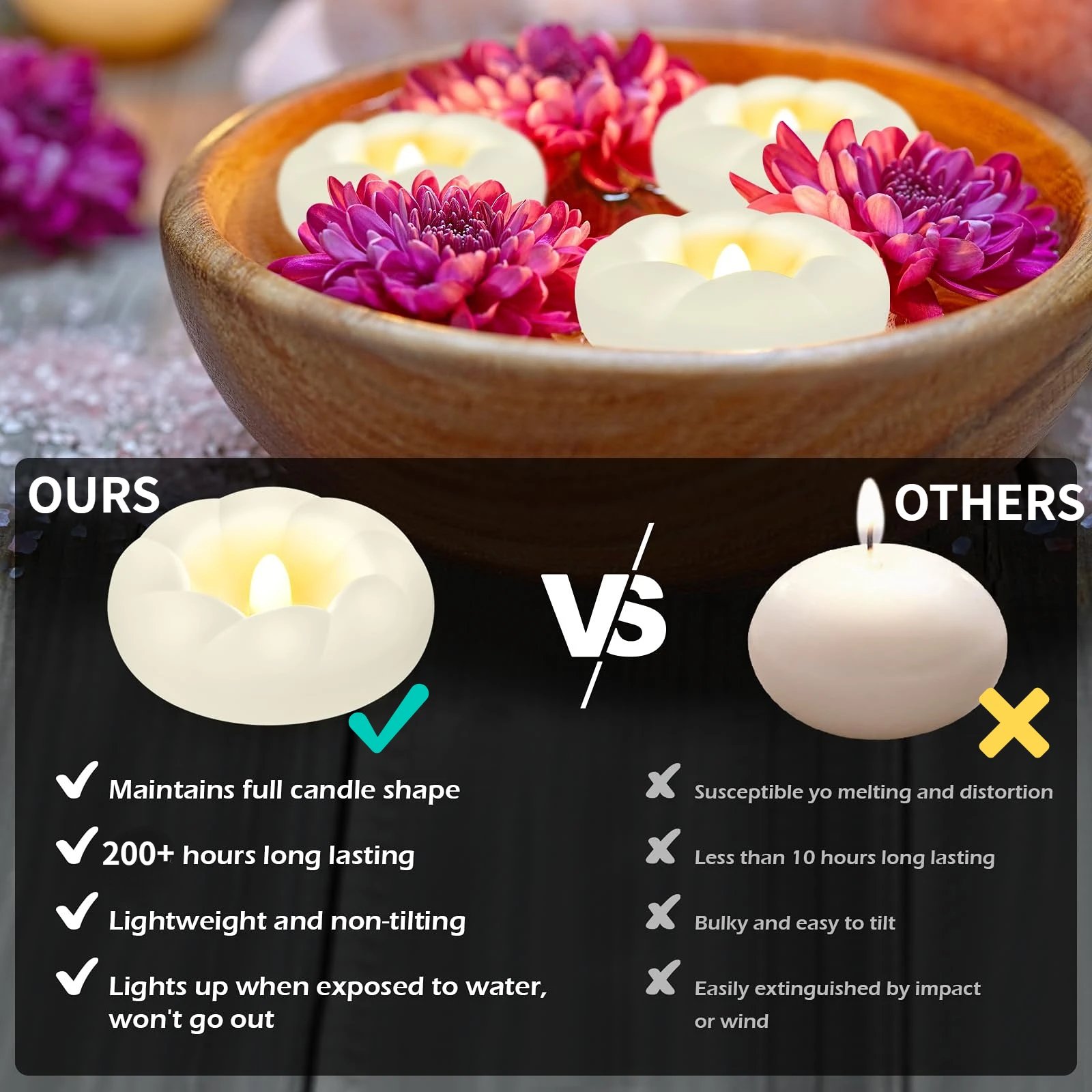 Our LED white fake floating candles are lighter and won’t sink in pools. The wick remains lit regardless of airflow, moisture, or accidental bumps, ensuring a consistent ambiance at weddings and various parties