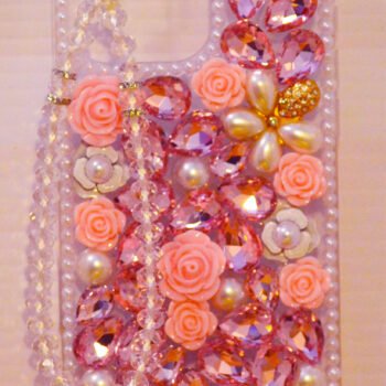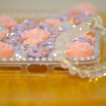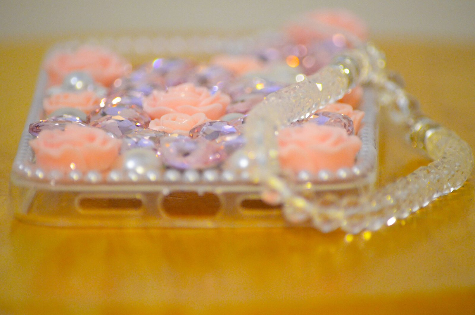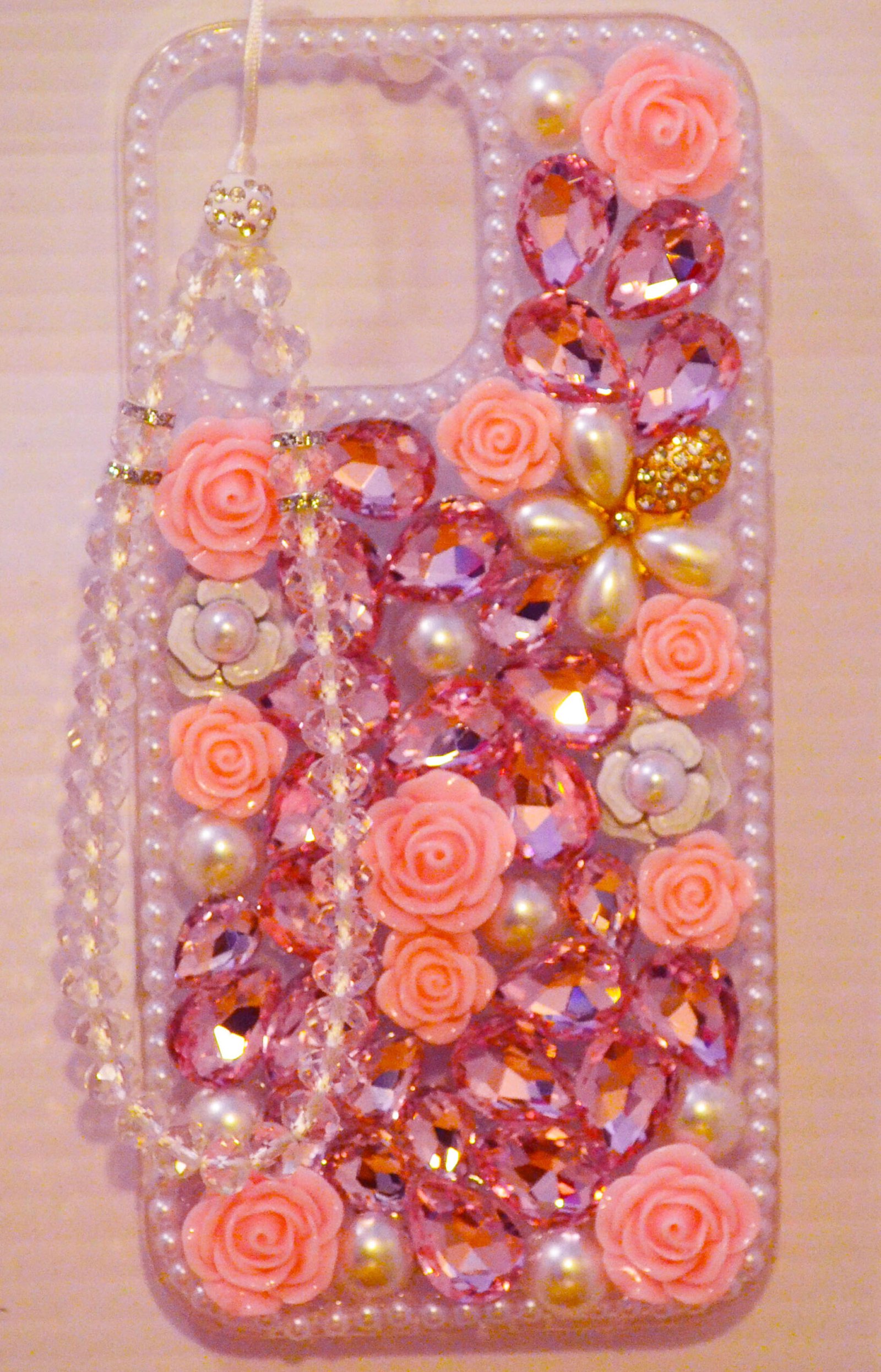 iPhone 16 Pro Max Mobile Case with Crystal Flower Design, Elegant Pearl Frame Glass, and Crystal Bracelet Lanyard